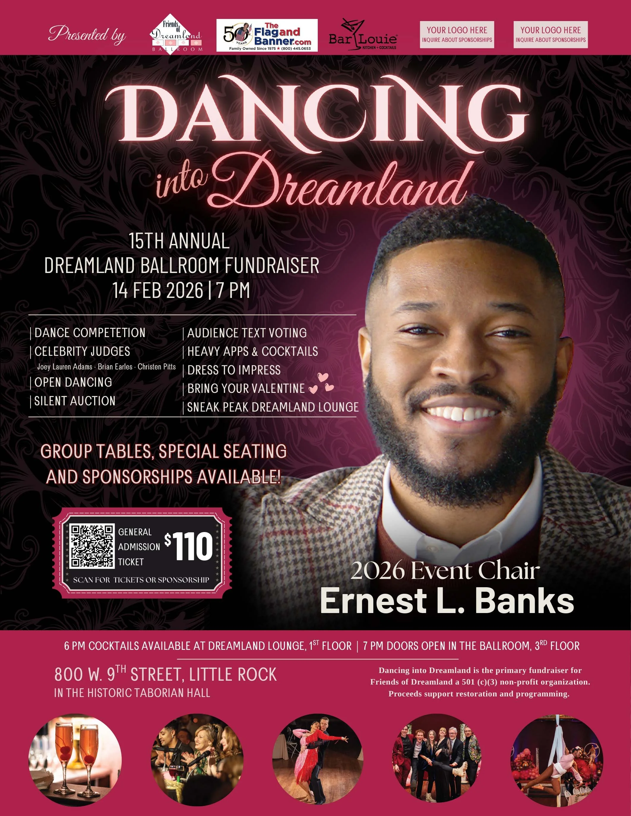 We're honored to welcome Ernest Banks as Event Chair for Dancing into Dreamland 2026. Ernest is an Architectural Designer and board member of studioMAIN, where he brings vision and creativity to projects across central Arkansas. He's also the design lead for Beyond the Divide, a spring 2026 initiative celebrating the heritage of West 9th Street through public art, tactical urbanism, and community programming. Ernest's leadership connects two important missions: preserving Dreamland Ballroom as a vibrant gathering place and honoring the cultural legacy of this historic corridor. His passion for design, community, and the stories that spaces tell makes him the perfect champion for this year's celebration.