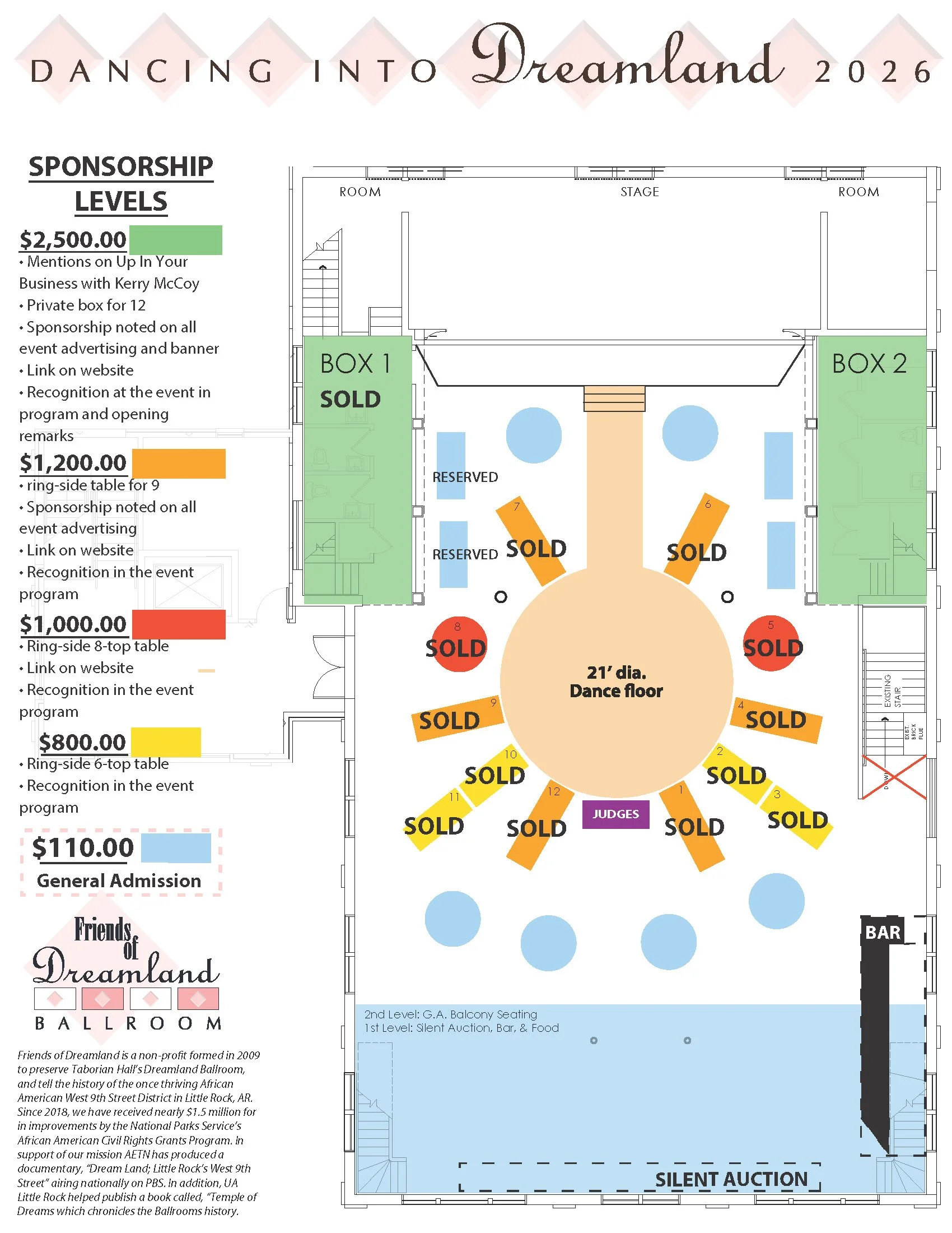 Table 8 seats 8 guests. This sponsorship level includes sponsorship mentions on all pre-event advertising, a link on dreamlandballroom.org, and recognition in the event program. Table denoted in red on the floorplan.
